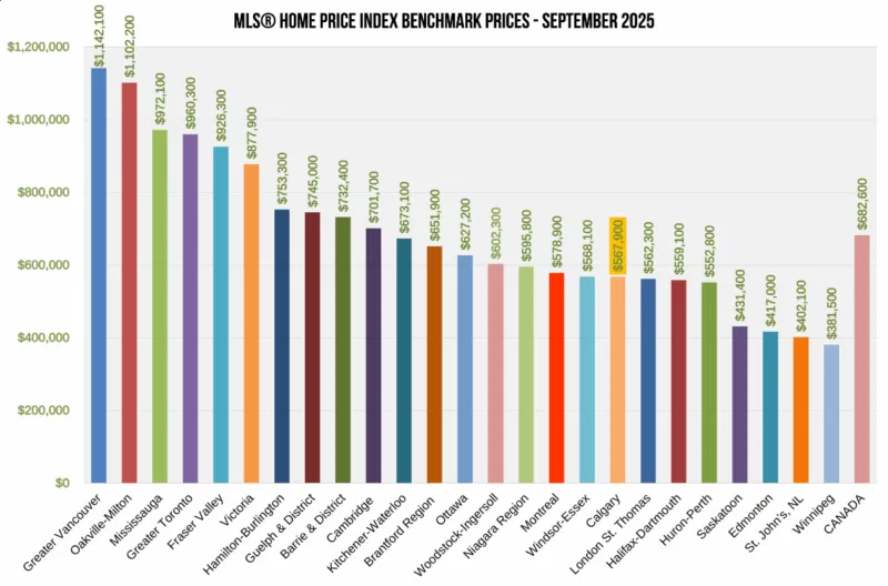The table below displays the average prices for September 2025 and MLS® HPI Benchmark Prices in LSTAR’s main regions.