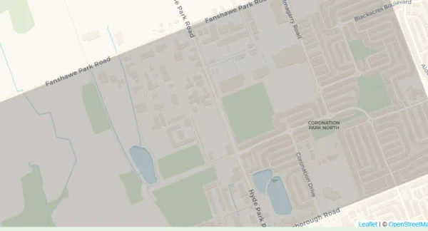 Hyde Park borders Fanshawe Park Road West to the north and east of Wonderland Road North and extends to the southwest corner of Oxford Road W.