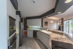 Ceramic floor in the kitchen, granite counter tops, custom-designed cabinets, a garbeurator, a Jenn-Aire stove top and LED lighting.